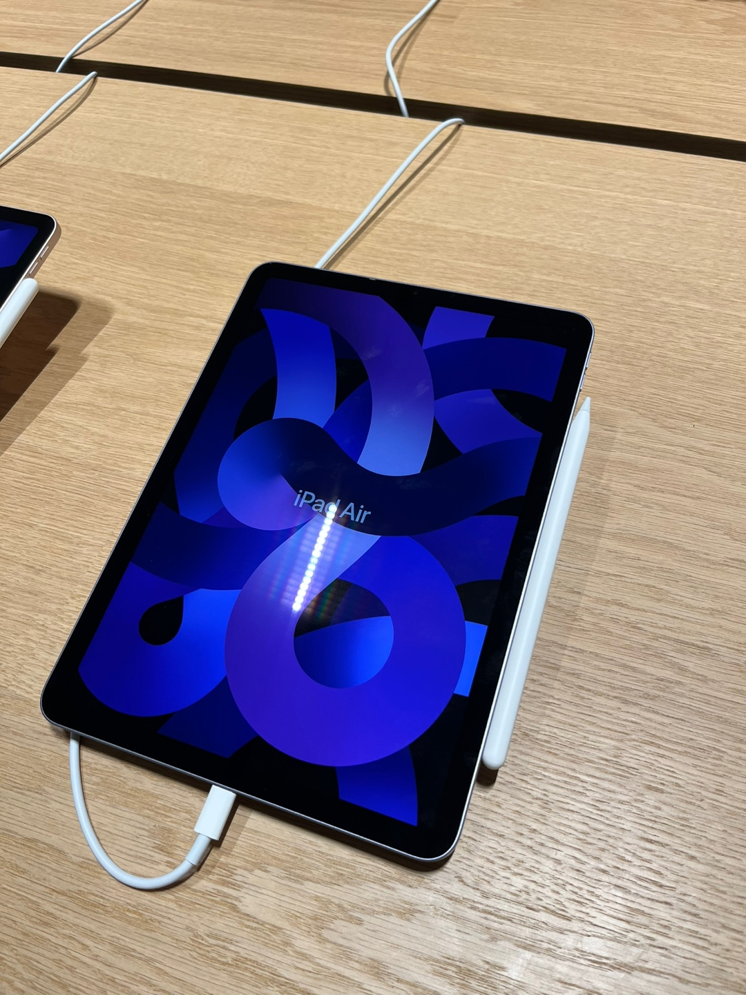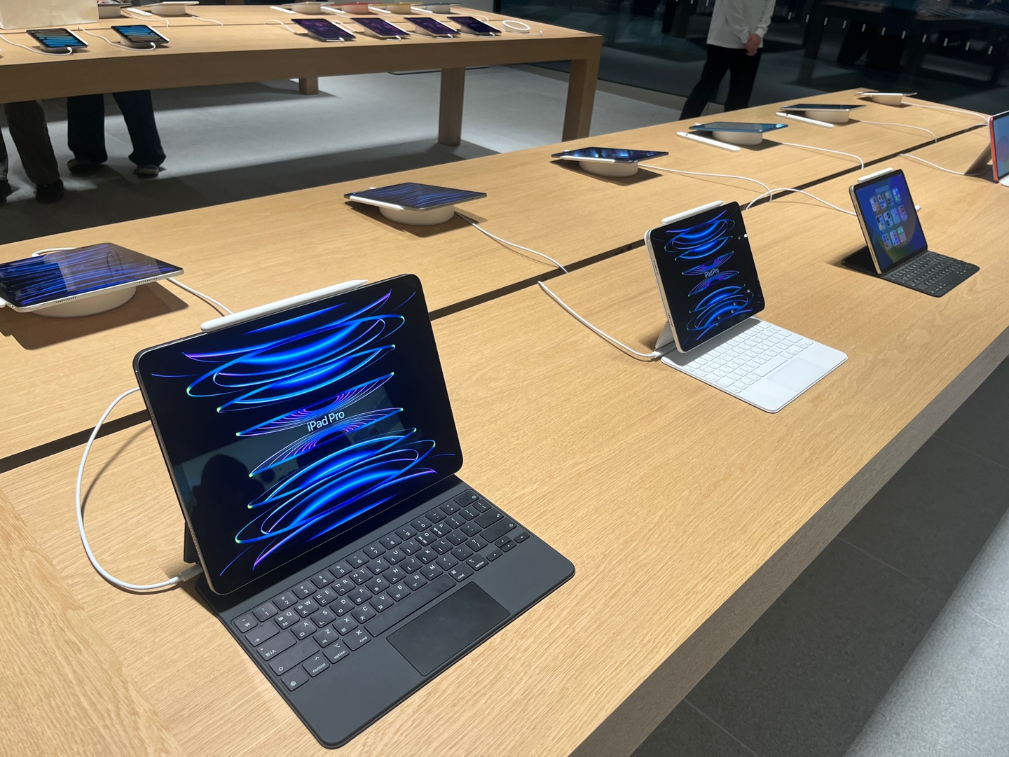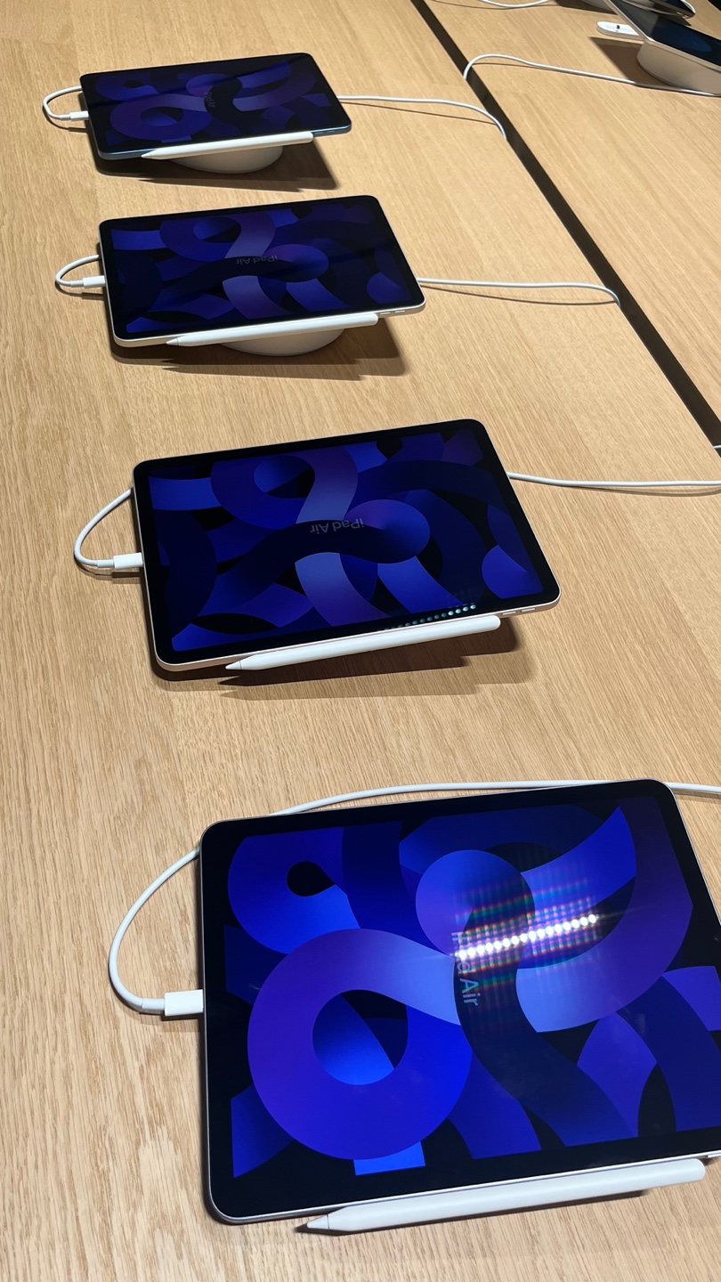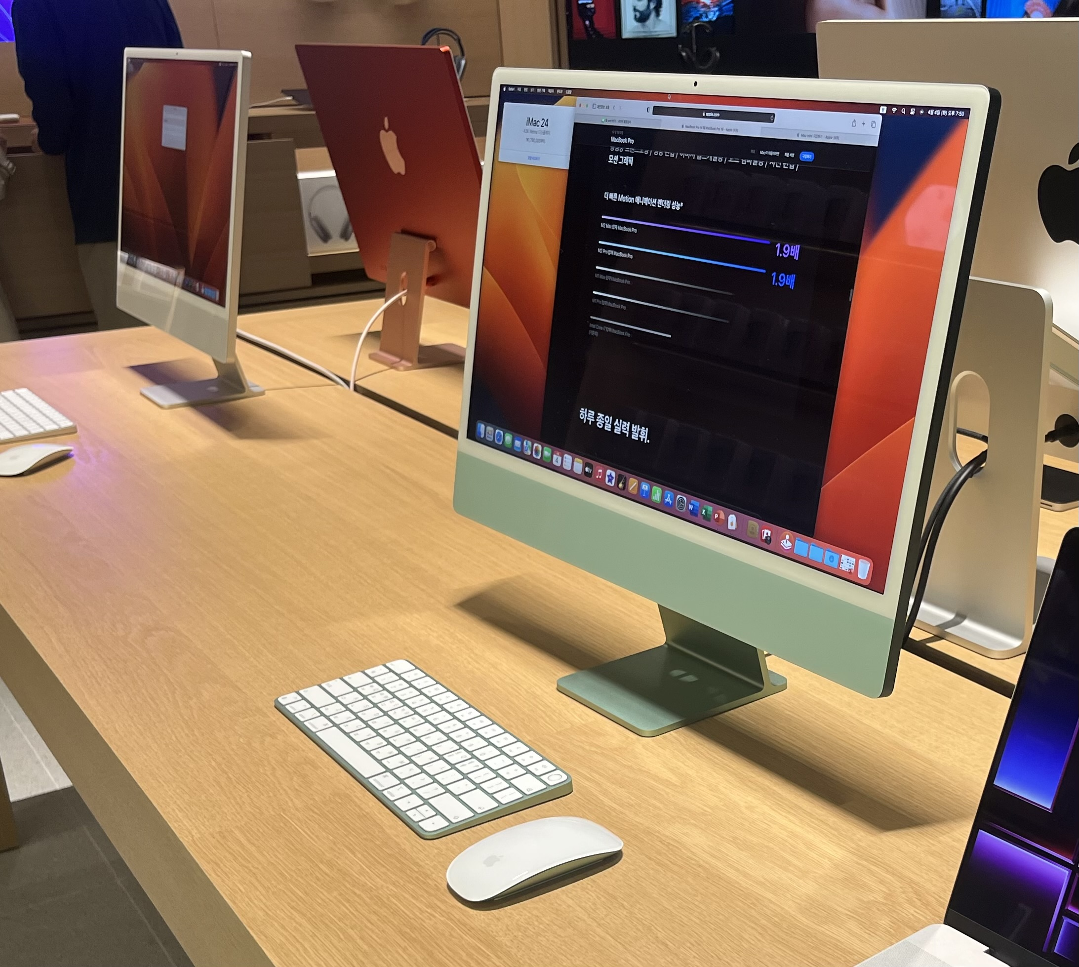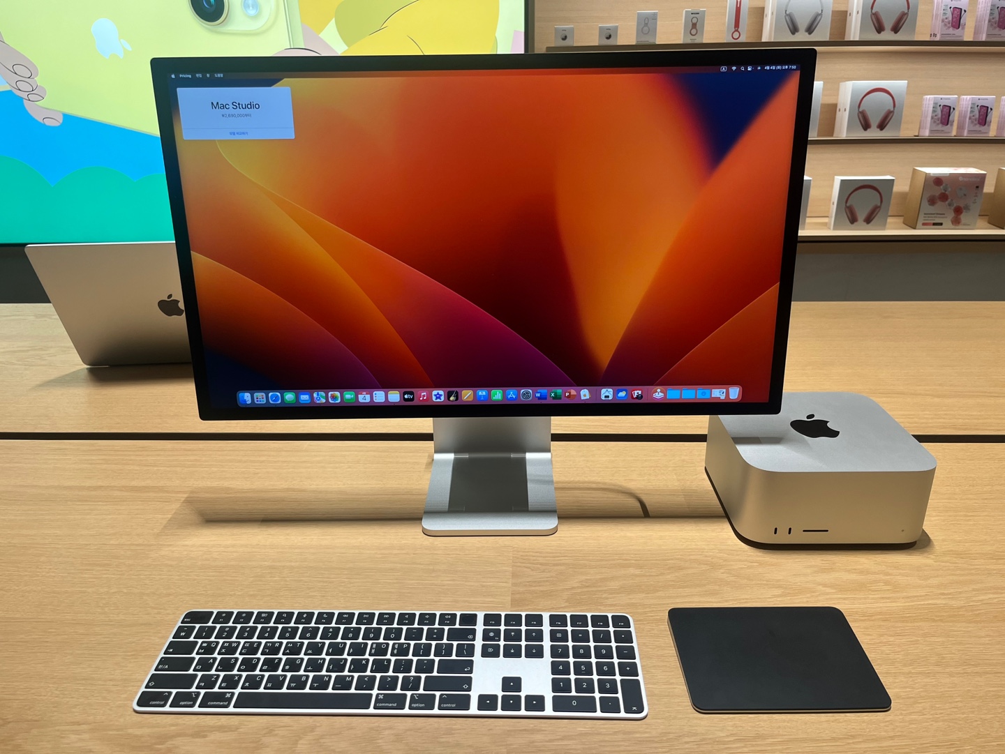 들어가서 출입구를 기준으로 왼쪽 끝 테이블부터 아이맥, 맥북, 아이패드, 에어팟 맥스가 나열되어 있습니다.