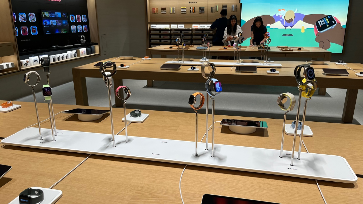 애플워치 기둥에 매달려있는 건 그냥 전시용이고요, 테이블 위에 올려져 있는 애플 워치는 착용할 수 있어요. 스테인리스도 차보고 싶었는데 착용할 수 있던 거에는 알루미늄이랑 울트라만 있어서 아쉬웠답니다. 친절한 직원분이 착용을 원하면 가져다준다고 했는데요. 한번 착용해 보자고 가져달라고 하기는 미안해서 됐다고 했어요.