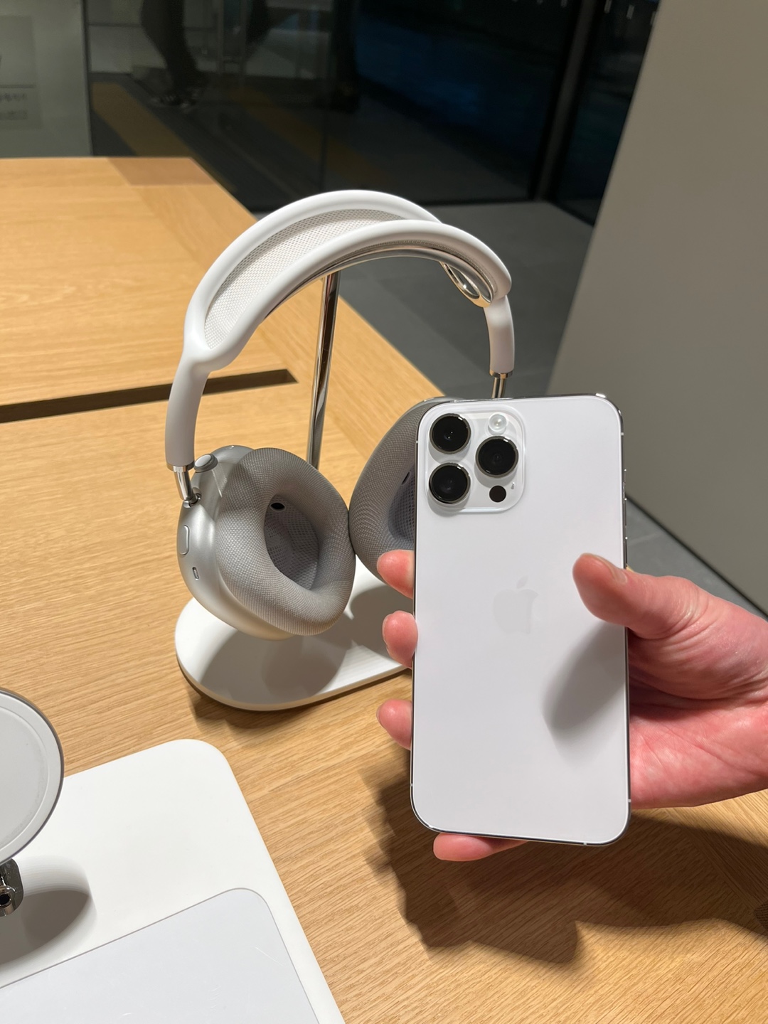 에어팟 맥스는 착용해 봤는데요. 노이즈캔슬링 기능이 워낙 좋아서 앞에 사람이 말하는 것도 잘 안들리더라고요. 이렇게 직접 착용하고 이용할 수 있도록 전시되어 있답니다.