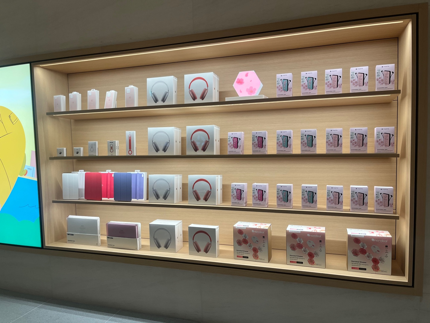 벽면에는 다양한 애플 제품 및 소품들이 진열되어 있습니다.